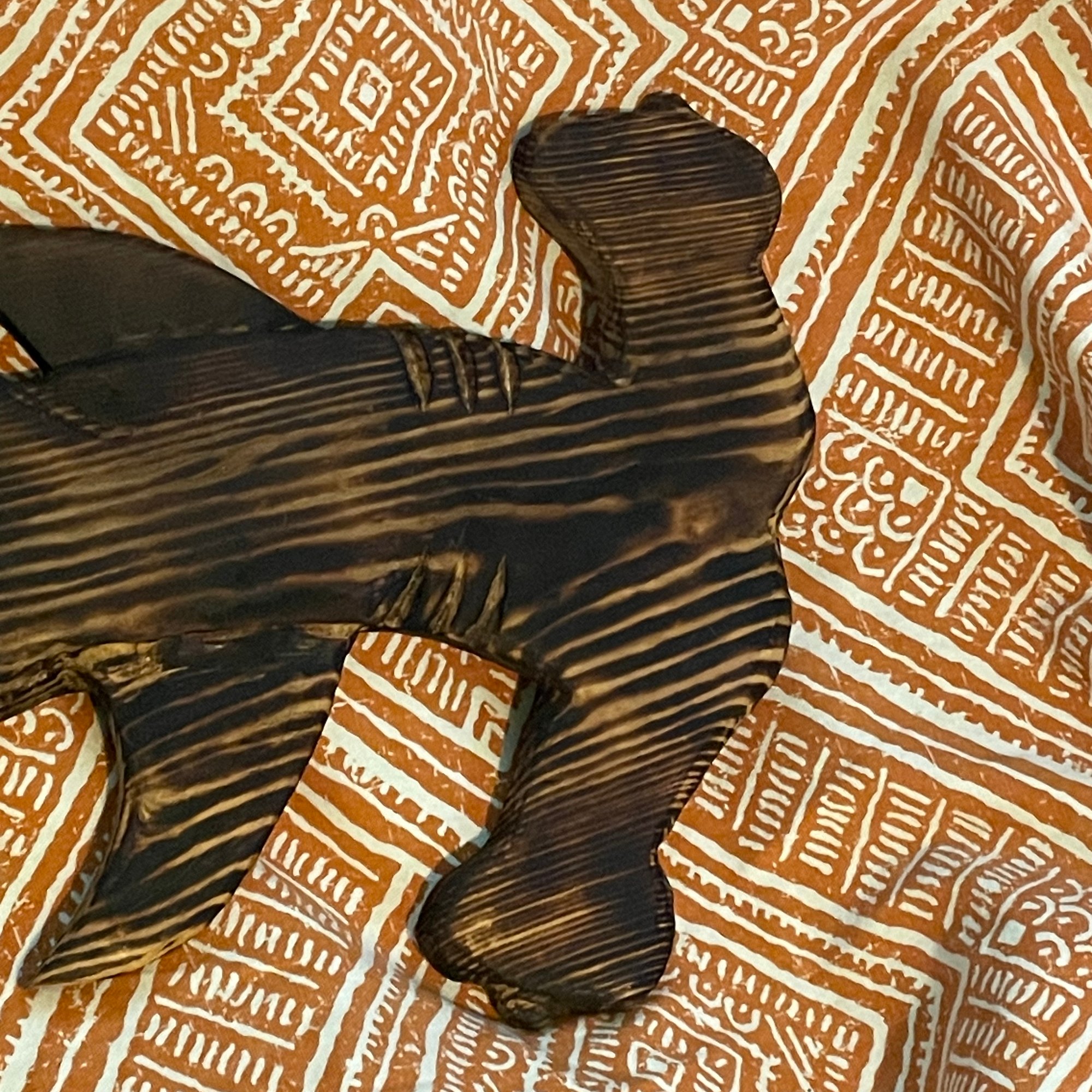 From the murky depths of the ocean comes the sea creature that mosts resembles a carpentry tool ( or at least tied with the Phillips head jellyfish): THE HAMMERHEAD SHARK! Carved, charred, and sealed to give it that tropical mid-century look, this beasty is ready to hang on your wall.