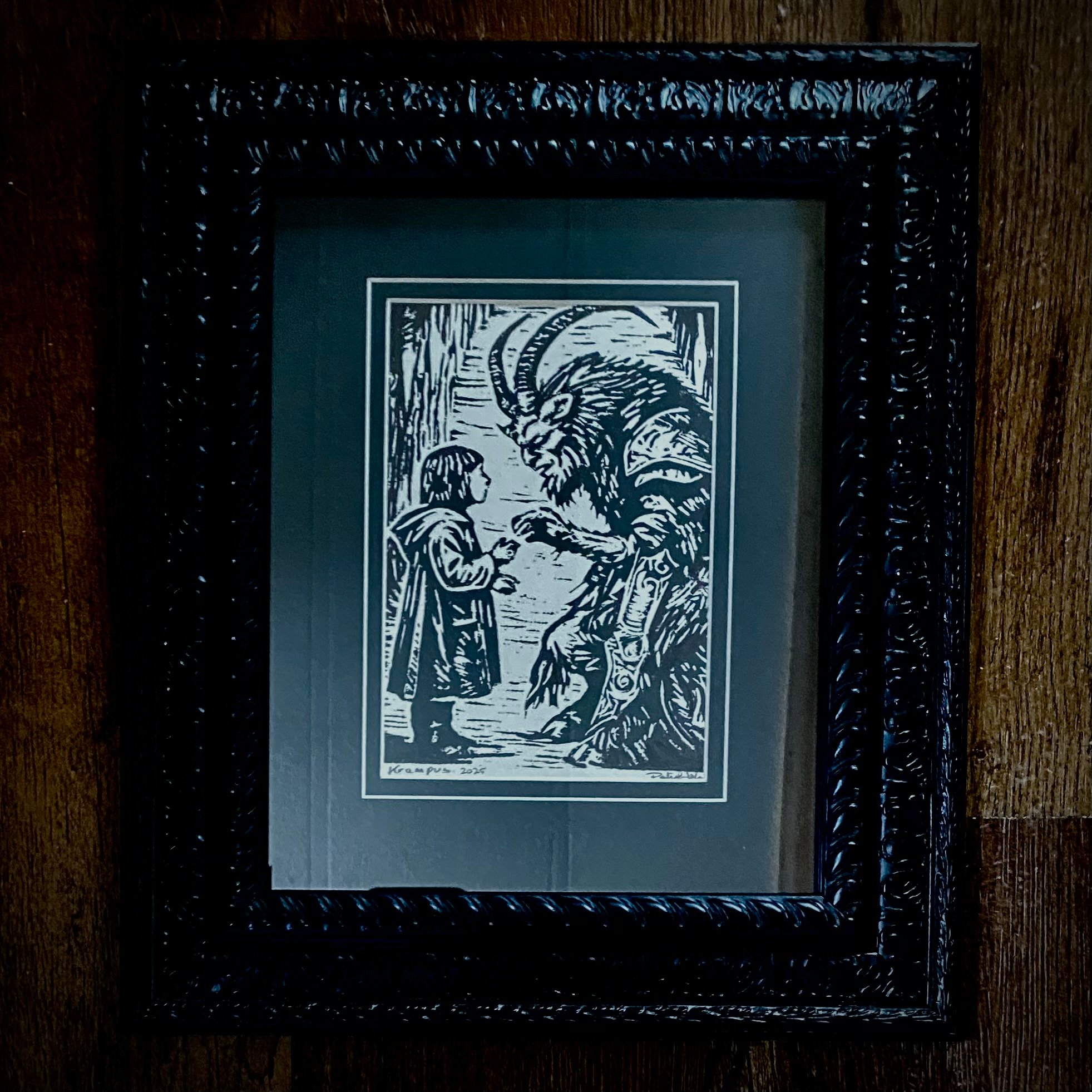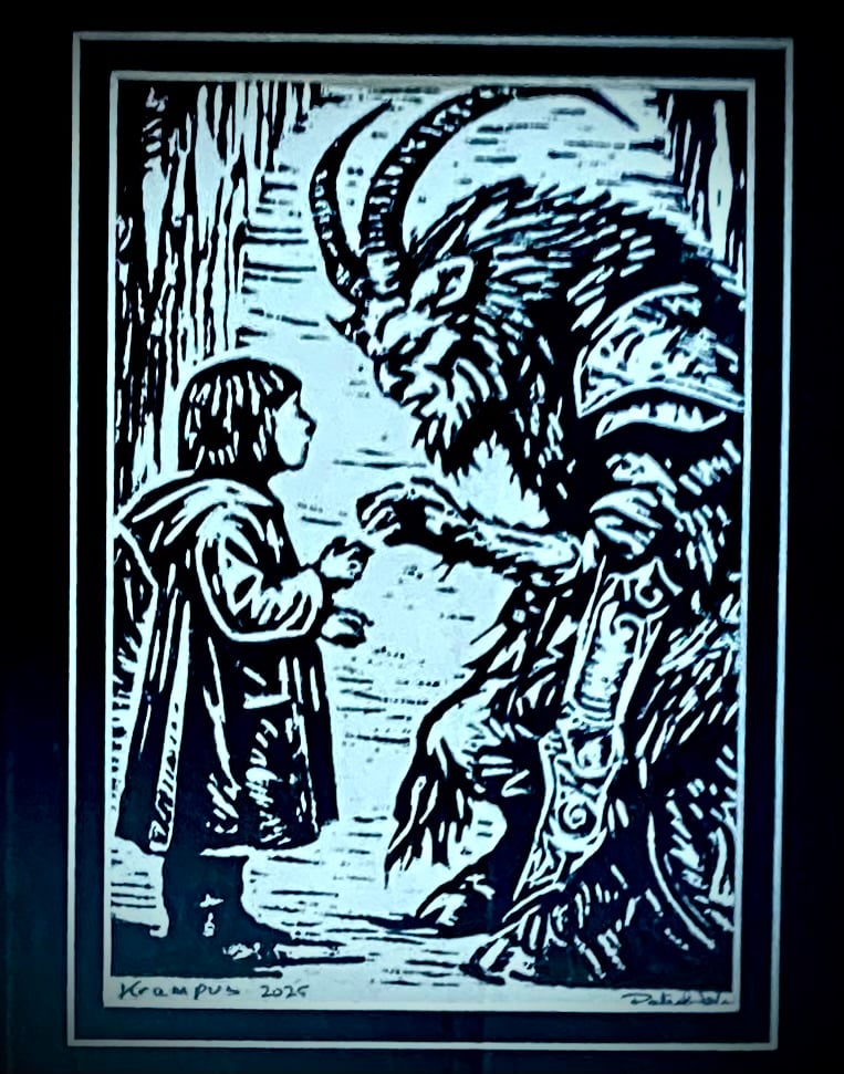 Krampus is coming and naughty kids should beware…but the good kids really have nothing to fear. This is the first of 10 prints made from a hand carved Lino block. It is a 5x7” print on acid-free paper and mounted in an 8x10 frame.