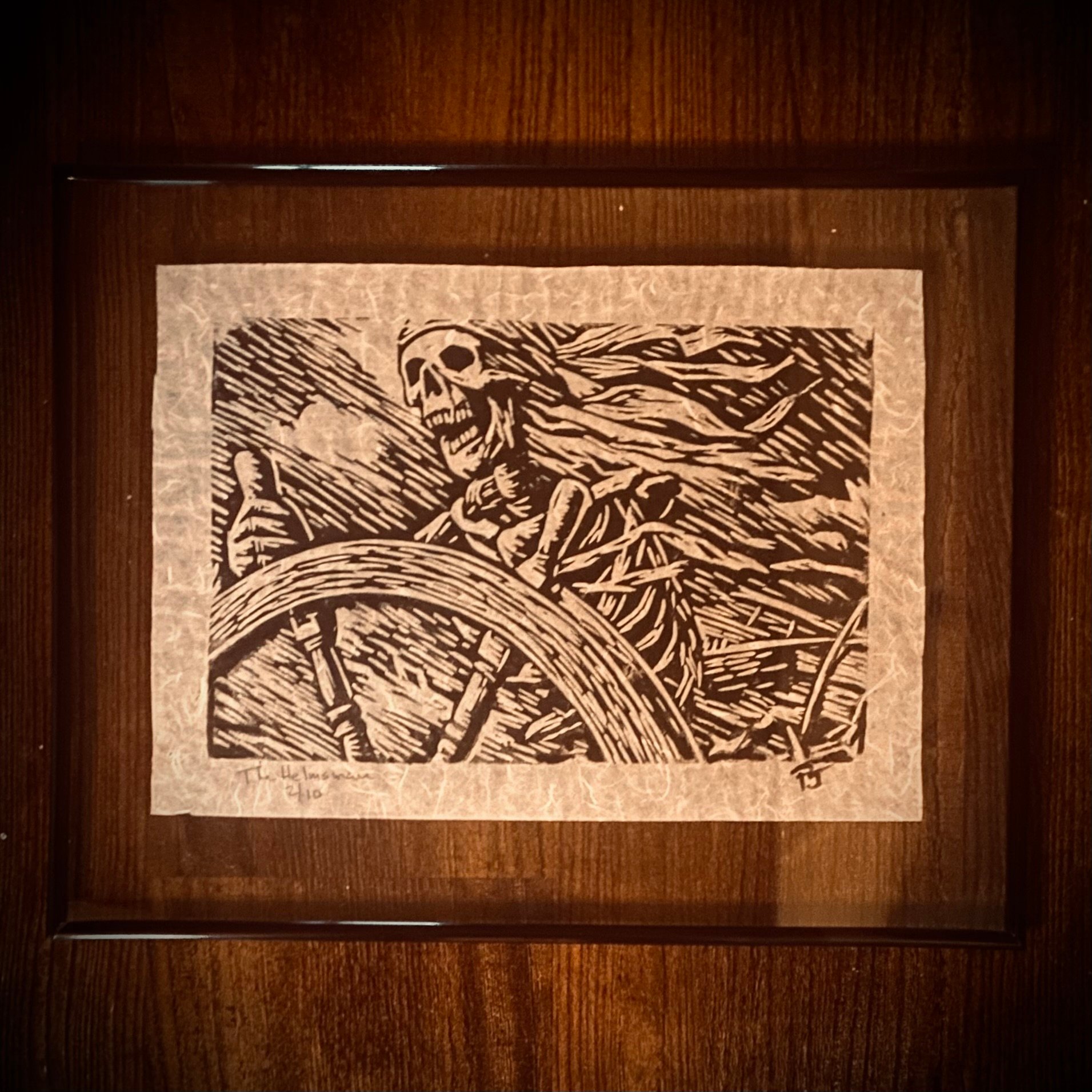 Here is a new take on the best of the Pirate-themed tableau….the Helmsman. This piece is the first of a limited run of 10 prints from a hand carved block. This one is printed on 8x10” fiber paper and mounted in an 11x14” floating frame.