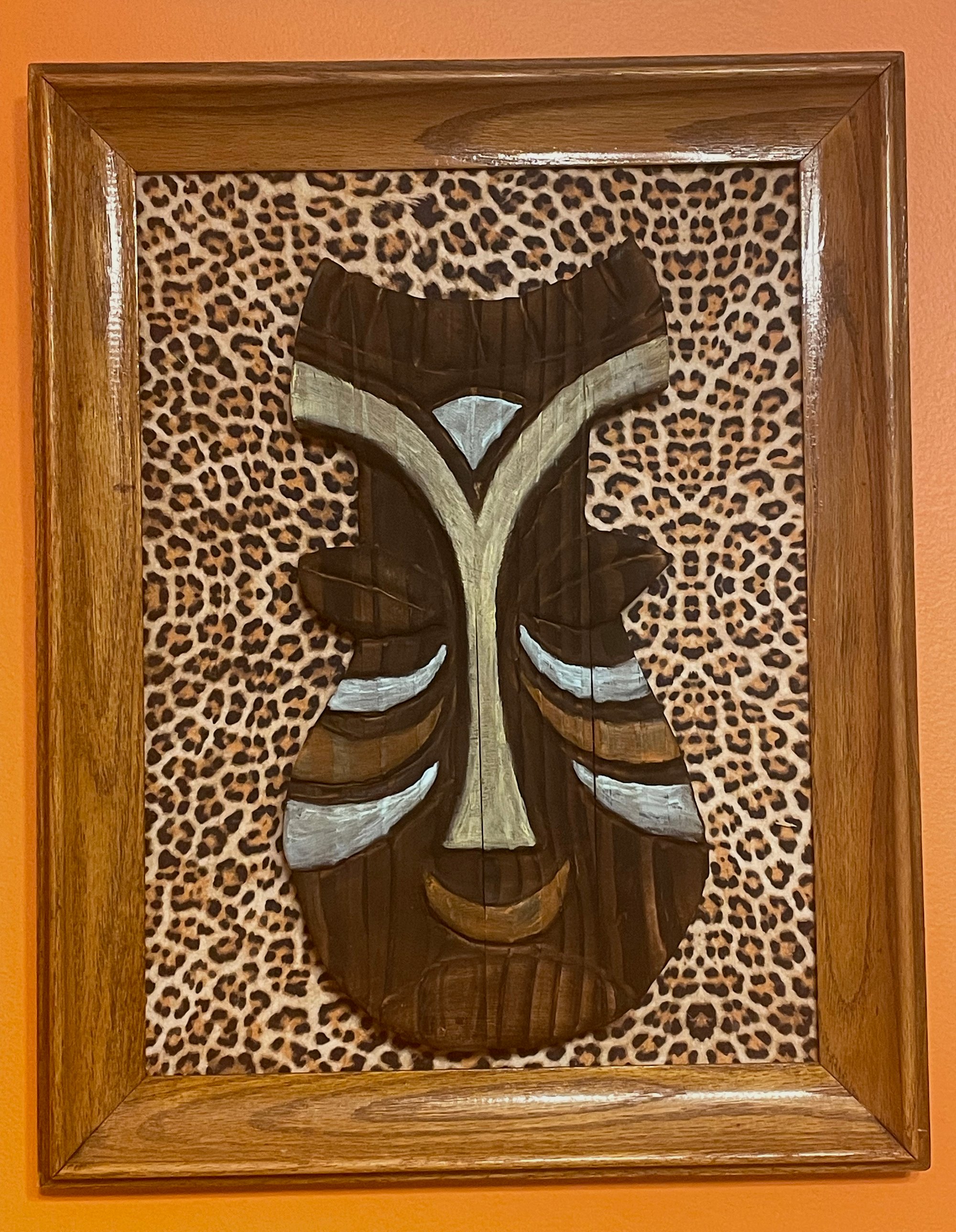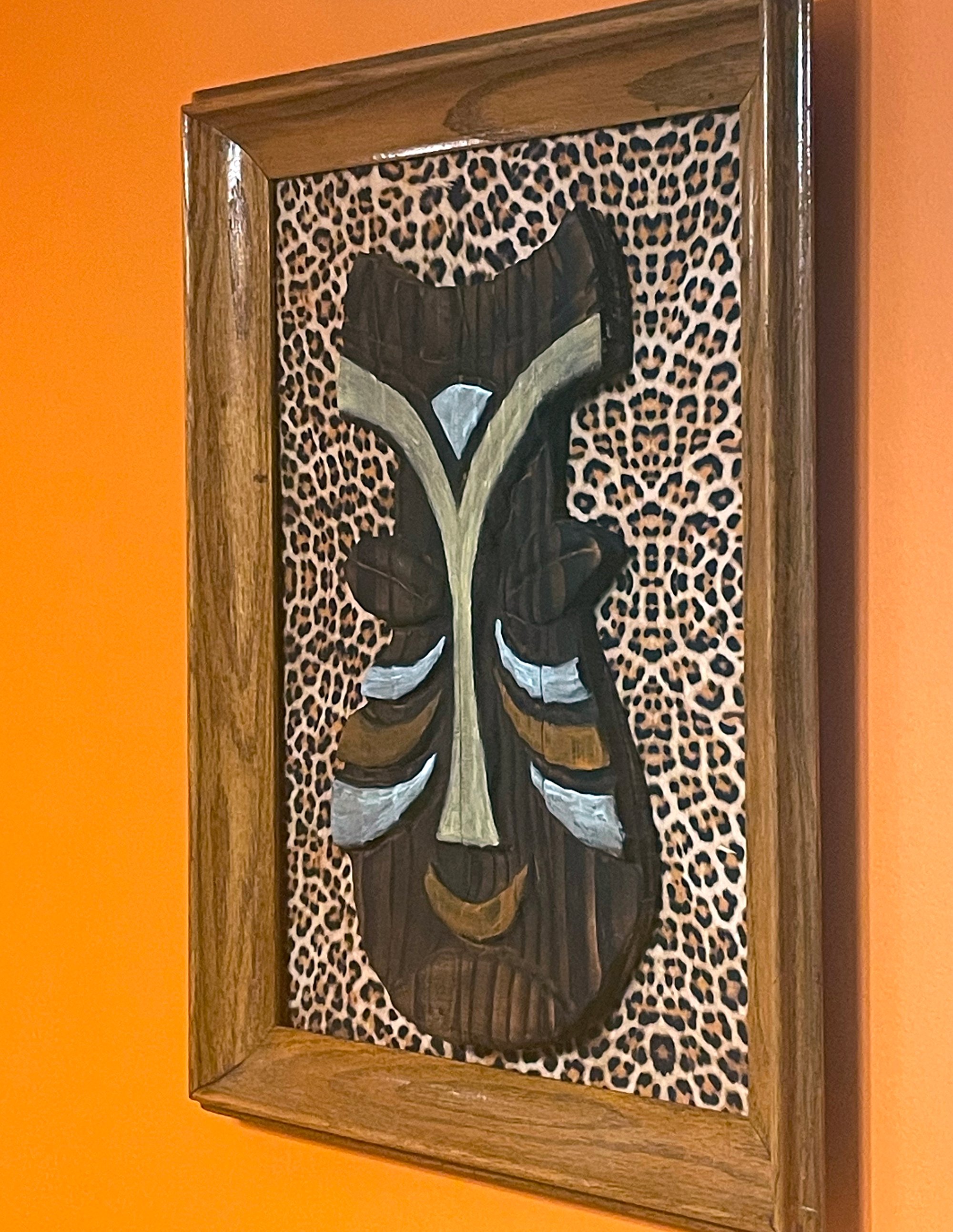 This cheerful fellow is ready to bring chill times and good vibes to your tiki bar, mid-century lounge, or your panic room (he'll help you not panic). Hand-carved, charred, painted, and sealed for longevity. Mounted with a leopard-print cloth backing, and placed in a vintage frame. Measures 19" x 15". Put him up, kick back, and chill out.