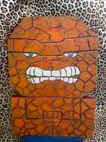 "IT'S TIKI-ING TIME!' He's big, orange, and fantastic. This grimm-looking tiki has been carved into a flat board, then painted, stained, and sealed. No cosmic rays were used in making this tiki.