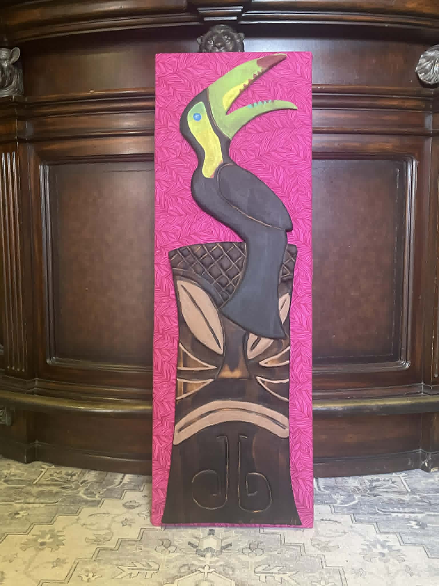 Measures 3' tall by 12" wide by 1" thick. Toucan and tiki are carved, burned, painted, and sealed and mounted on a wood back wrapped in fabric. Eyelets and wire are mounted on the back for easy hanging and display.