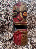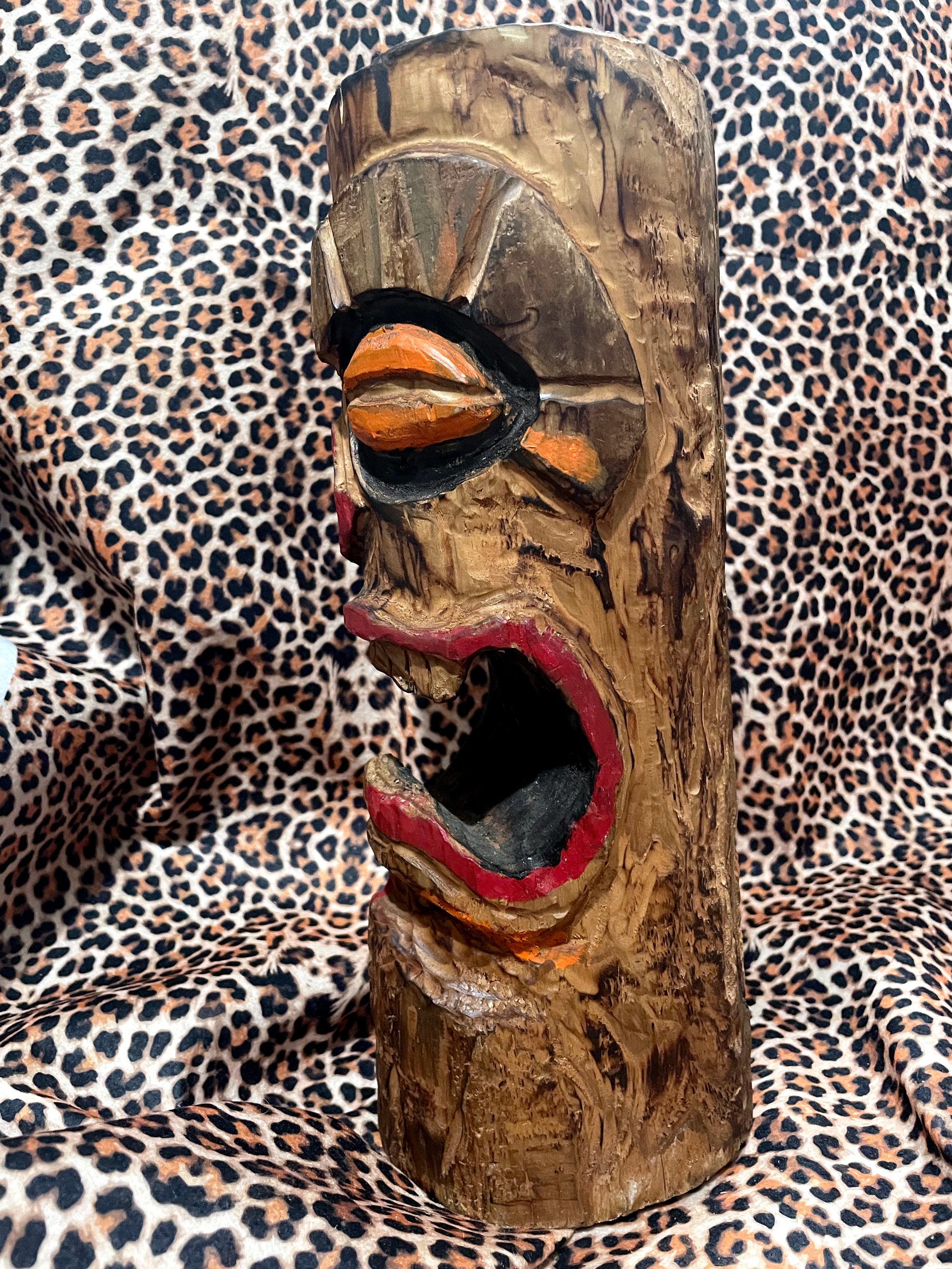 Is he smiling or is he grimacing? This tantalizing totem keep you guessing as you gaze into his cavernous maw. Carved, charred, painted, stained, and sealed for indoor or outdoor conditions.